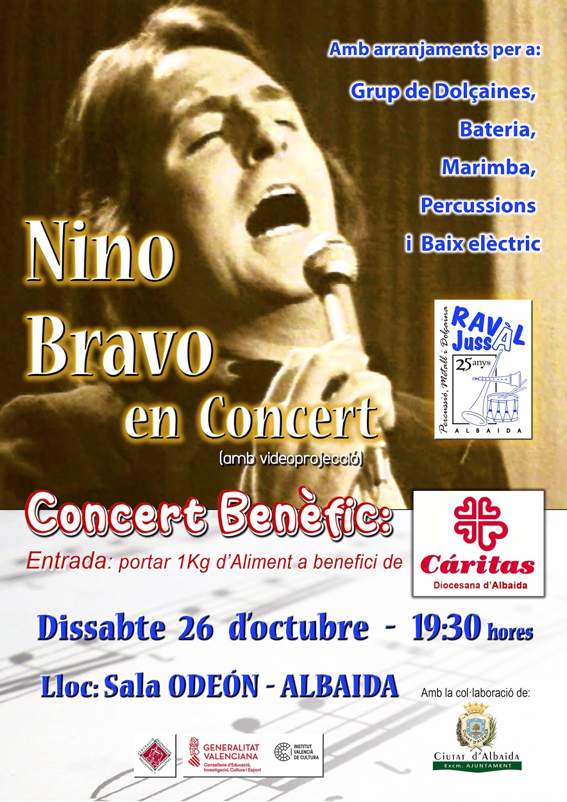 El dissabte 26 realitzarà el Raval Jussà un Concert Homenatge al cantant NINO BRAVO, amb arranjaments per a grup de dolçaina, percussió, marimba, baix elèctric i bateria. En ell podrem escoltar les peces musicals més conegudes del cantant i descobrirem els llocs i els motius per als que es van crear de manera ordenada en el temps.